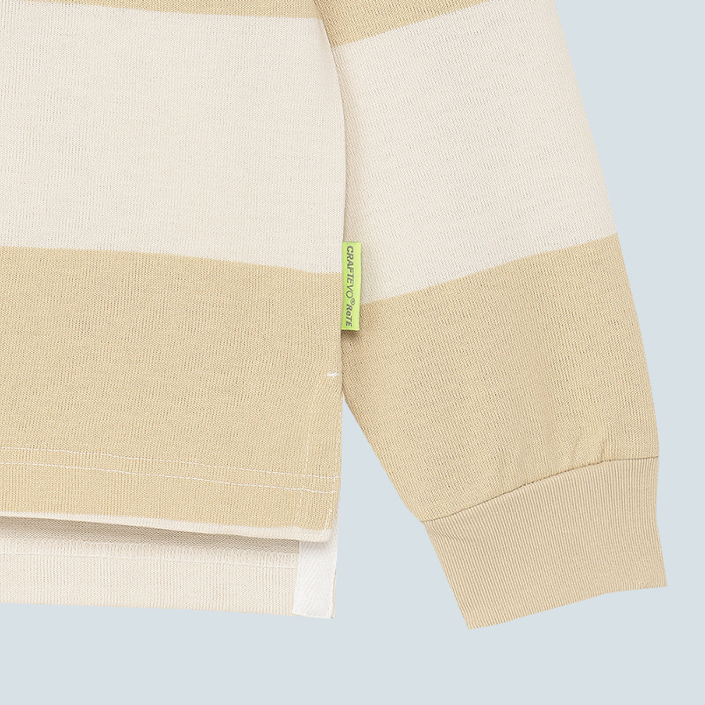 上品さと軽やかさを併せ持ち、日常に溶け込むラグビーシャツ クラシックなラグビーシャツを、洗練されたバランスで再構築。大胆なワイドボーダーに、クリーンな白衿を合わせた一枚です。ほどよくゆとりのあるシルエットが、リラックス感とモードな空気を両立。ドライタッチのポリエステル混コットン素材で、軽やかに着こなせます。 ネイビー×グリーンの深みあるトーンと、ベージュ×ライトベージュの柔らかな配色の2色展開。デニムやスラックスなど、合わせるボトムを選ばず、シーズンレスに活躍します。カジュアルを超えて、日常を少し上品に見せるラグビーシャツです。 着用モデル:身長163cm / 着用サイズ:M   和歌山で糸染め、和歌山で編んだワイドボーダー 素材は、ドライな質感とほどよいハリを持つポリエステル混コットンジャージー。和歌山で編み、同じく和歌山で糸染めしたボーダー柄です。空気を含むような軽さがあり、季節を越えて快適に着られます。肩の力を抜いたゆとりあるシルエットが、自然体の美しさを引き立てます。   素材:本体   綿55%、堆肥分解性ポリエステル45%フライス  堆肥分解性ポリエステル 61%、綿 39%衿  綿 100% 機能:吸水 / 速乾 / 堆肥分解対応商品(COMPOSTABLE) 生産国:日本   CRAFTEVO ReTEの表記(ネーム)がついている商品は私たちが責任をもって自然に返していきます。回収のご協力お願いいただければ幸いです。...